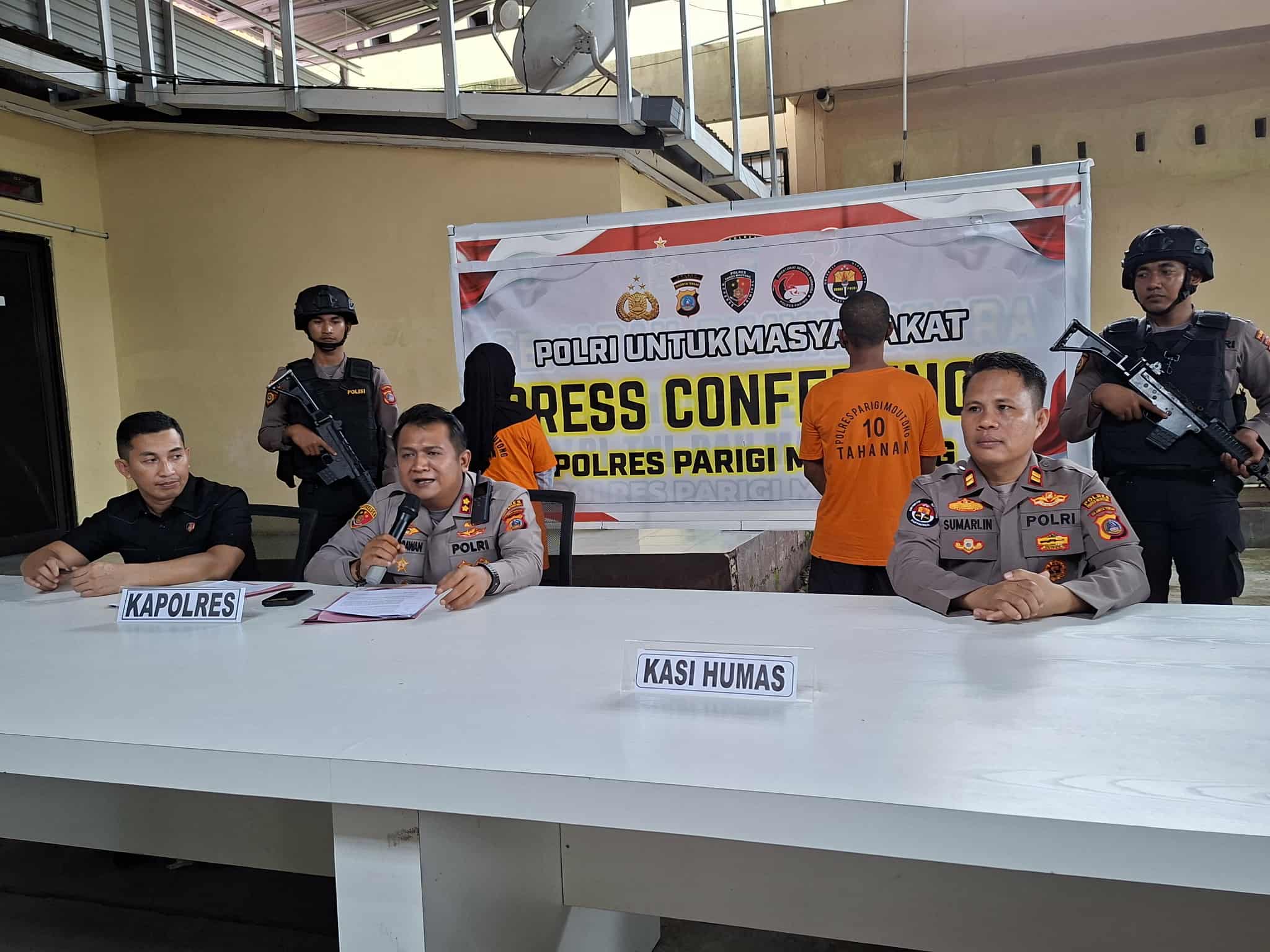 Kapolres Parimo, AKBP Hendrawan A.N., S.I.K., M.H. (tengah) memimpin langsung konferensi Pers didampingi Kasat Reskrim Iptu Agus Salim dan Kasi Humas Iptu Sumarlin. (Foto : LN/Bambang)