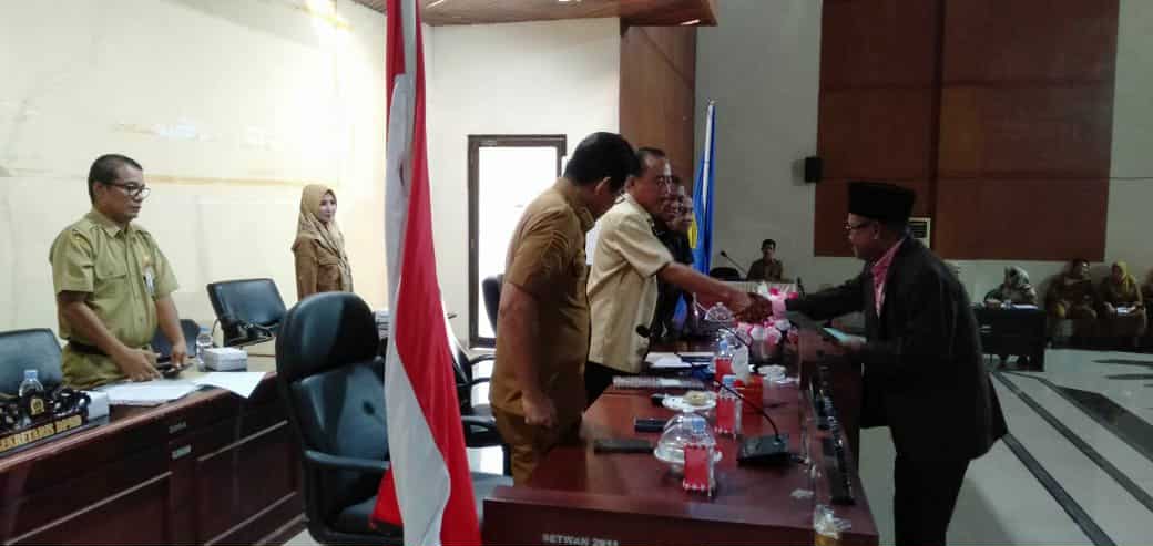 Sekretaris Fraksi Partai NasDem DPRD Parimo, Salimun Mantjabo, menyerahkan pandangan akhir fraksi partai Nasdem kepada Ketua DPRD, Alfred Tonggiroh. (Foto : Ist)