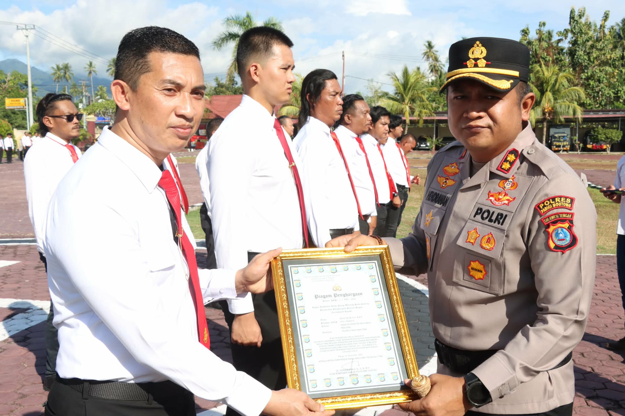 Pemberian penghargaan berlangsung saat apel Jam Pimpinan di halaman Mapolres Parimo, Senin (15/12/2025) pagi. Apel diikuti pejabat utama serta seluruh personel Polres setempat.